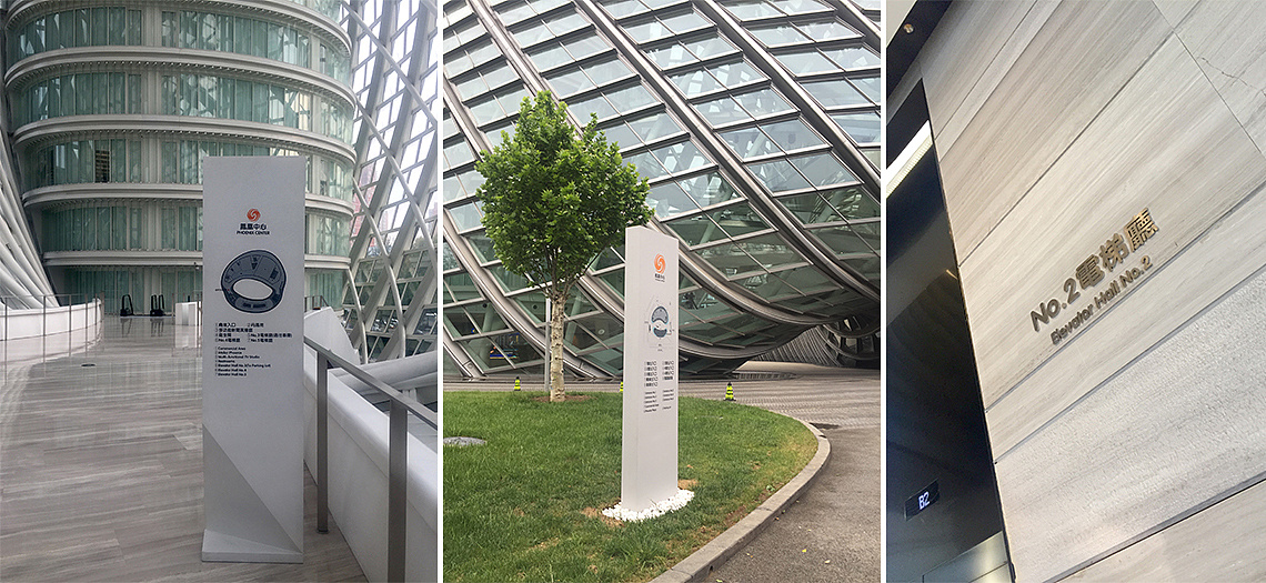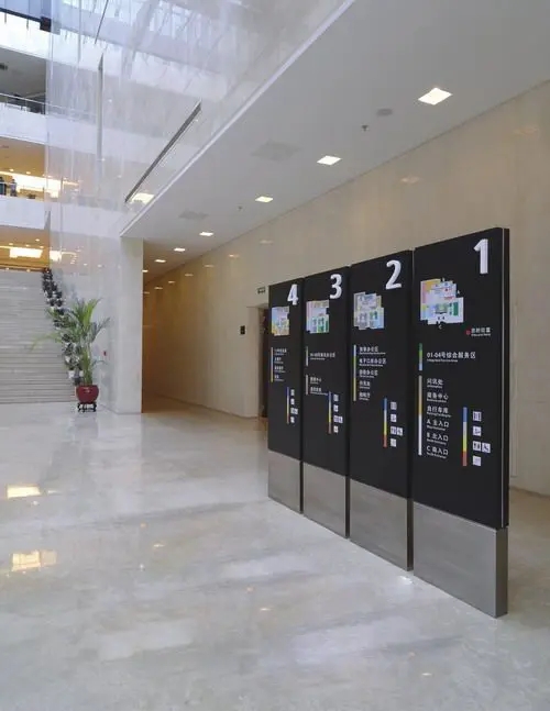 辦公區域中的落地式分流標識牌主要放置于在大堂、廣場或樓梯出口及岔路口等人員比較密集的場所,起著指示與導向的作用。在強調以人為本的社會,建筑作為流動的音樂,人文精神更是在其中得到體現。大型的落地式分流標識牌作為現代建筑的組成部分,其造型的設計、色彩的搭配及制作的工藝等均需仔細的斟酌,以使之與主體建筑及綠植相互輝映。